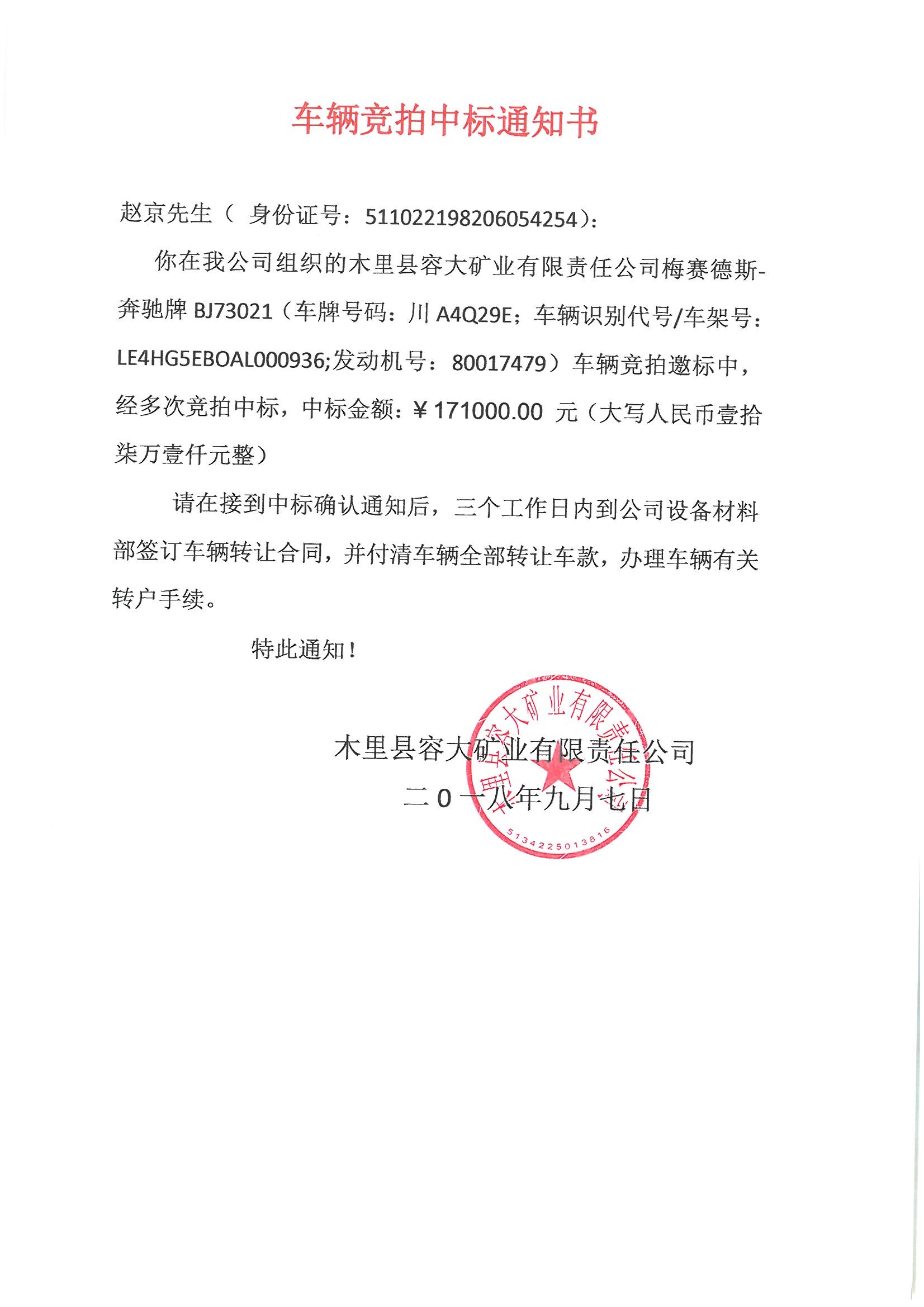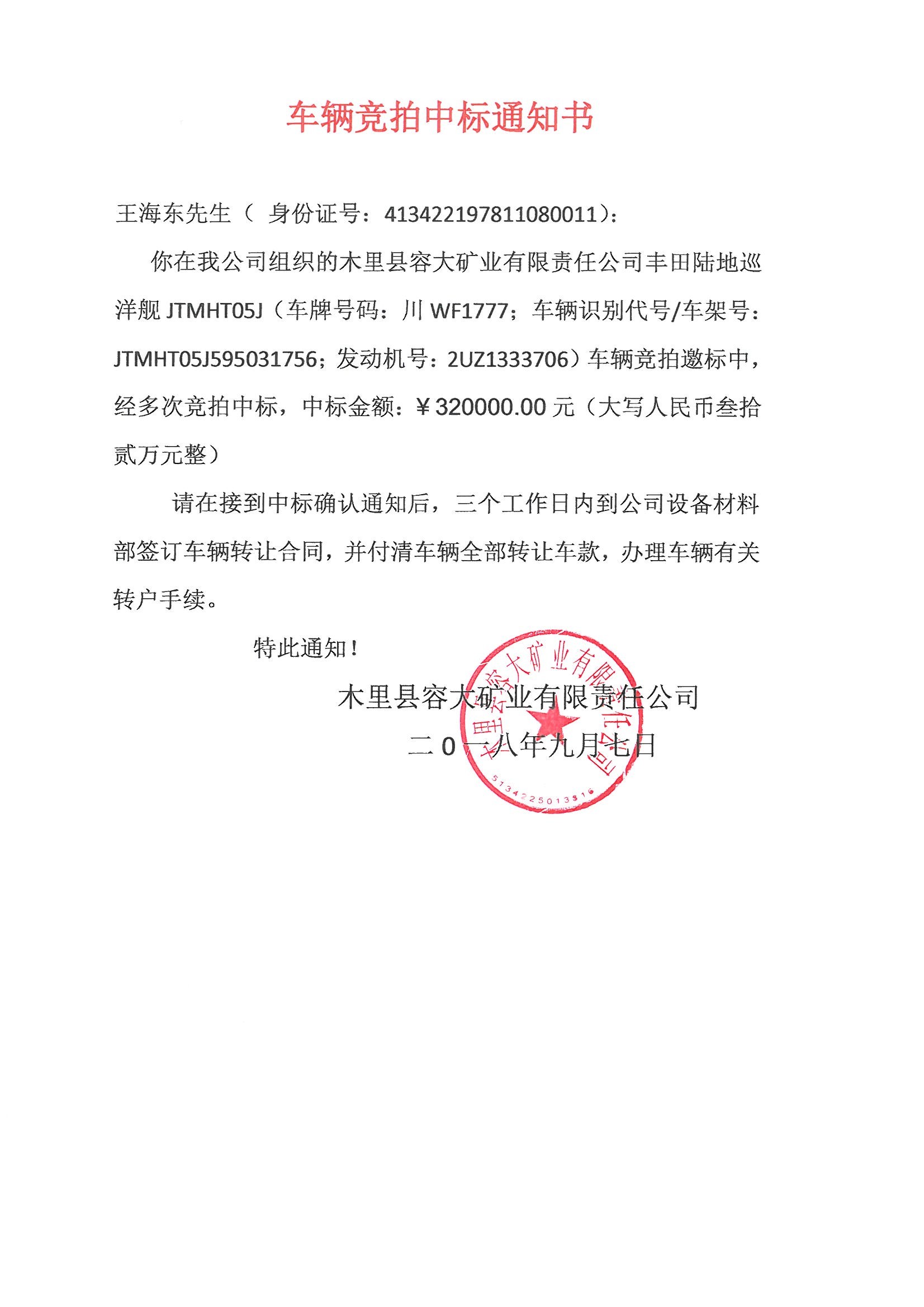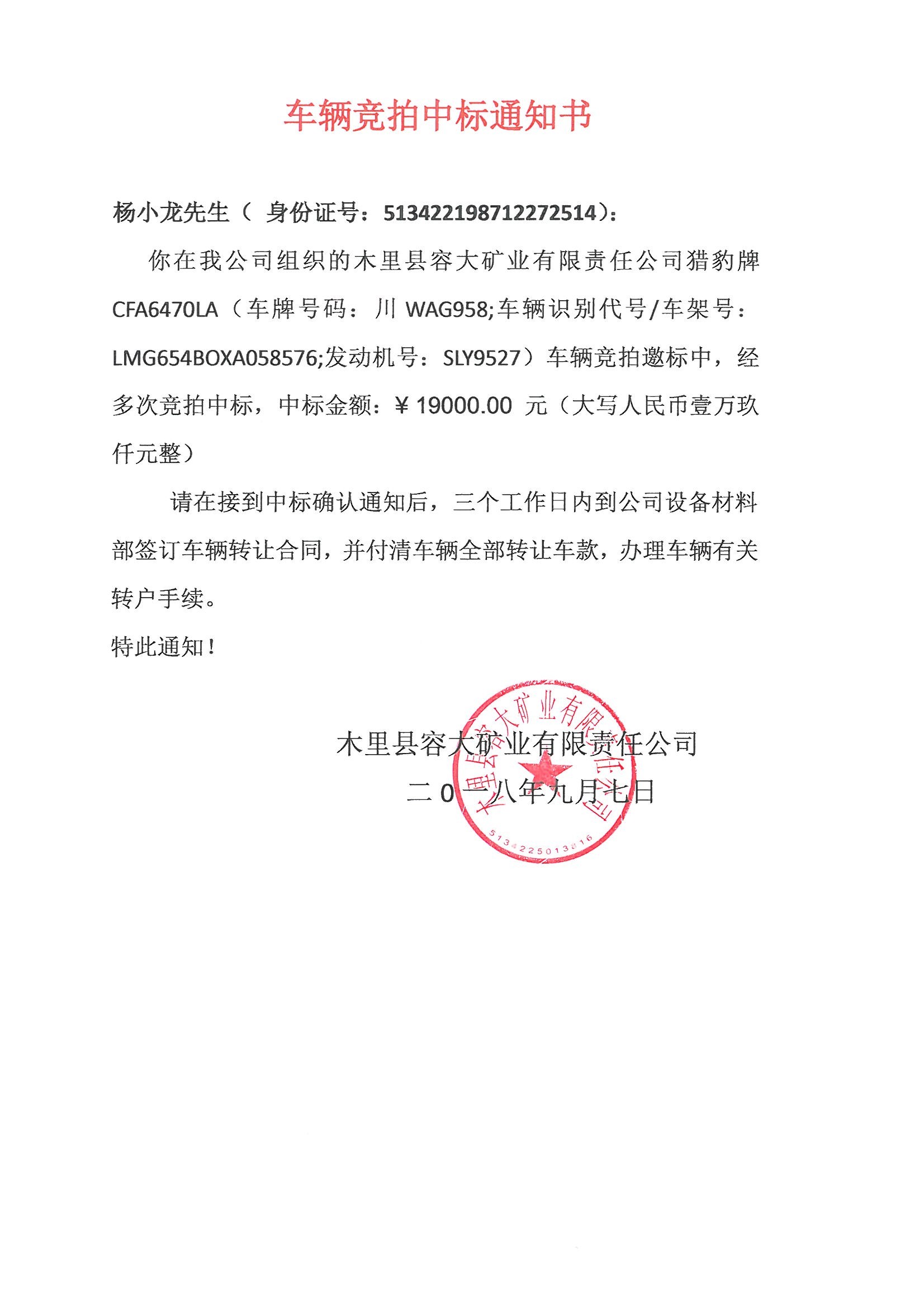 木里縣容大礦業(yè)有限責任公司車輛競拍中標通知書